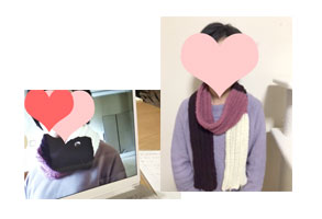 オンラインレッスンで完成したマフラーは、先生のアドバイスで端にボタンをつけてスヌードにもなる2wayデザインで、とっても気に入っています。