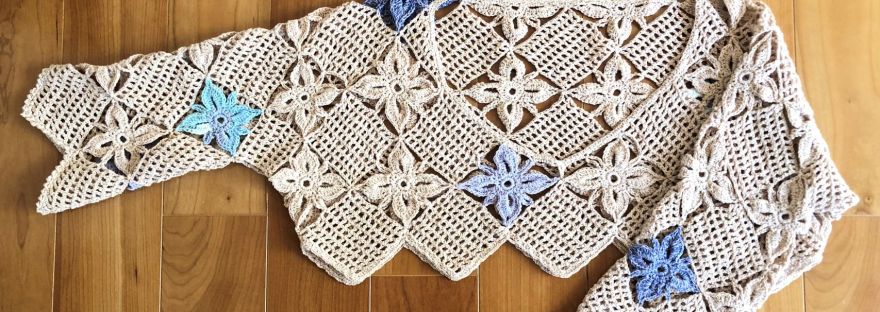 かぎ針編みの、モチーフつなぎのプルオーバー。