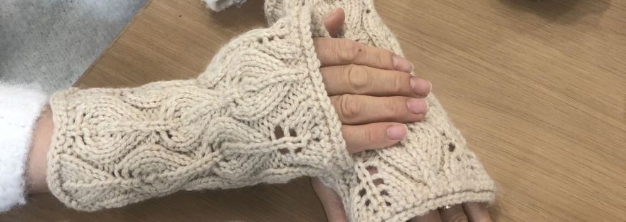 Oさんは、木の葉のハンドウォーマーを編んでくださいました